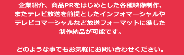 • 「プロモ制作.com」は、現役テレビスタッフが集結し、テレビマンならではの演出力と技術力で、クライアント様のイメージを良い意味で裏切る様なクオリティの高い映像制作を行っています。企業紹介、商品PRをはじめ、テレビ放送を前提としたインフォマーシャルやテレビコマーシャルまで幅広いジャンルの映像制作が可能です。